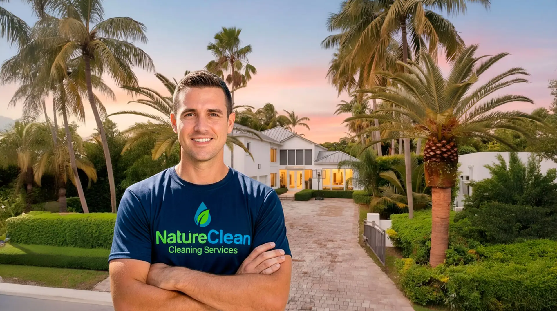 A smiling man in a NatureClean Cleaning Services shirt stands with arms crossed by a pool outside a modern, well-lit Bal Harbour house, surrounded by palm trees at sunset, showcasing expert sanitization services.